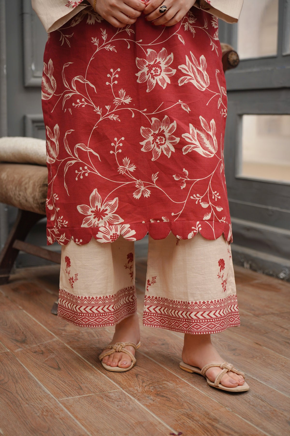 Refresh your style with our floral printed shirt featuring a buttoned neckline with full sleeves and scallops on hem.