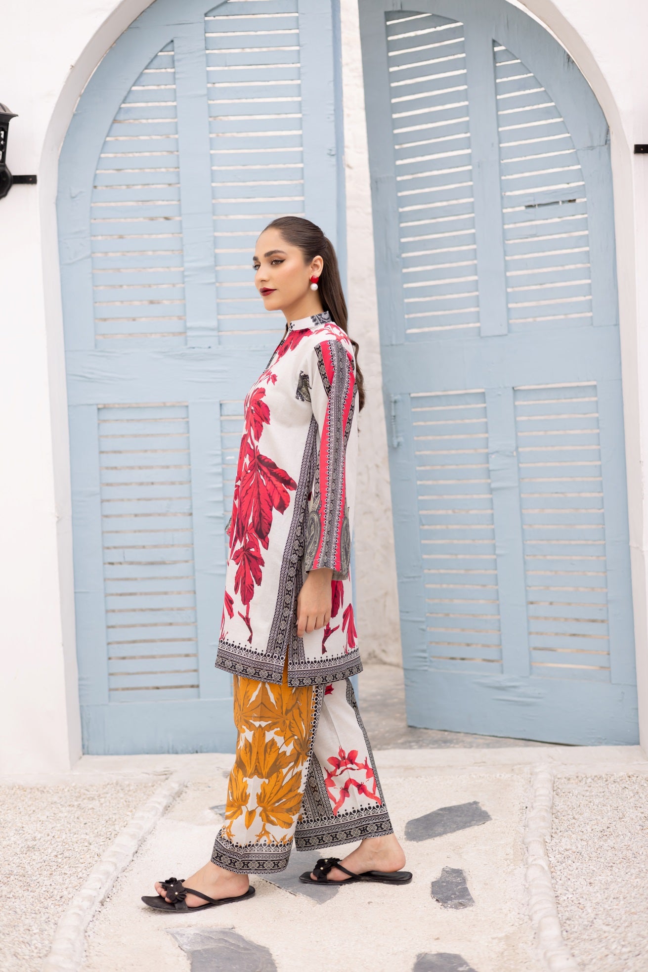 “DINA” colorful blend of two piece coord set, featuring short, straight shirt with a loose trouser. This is a perfect addition to your wardrobe.